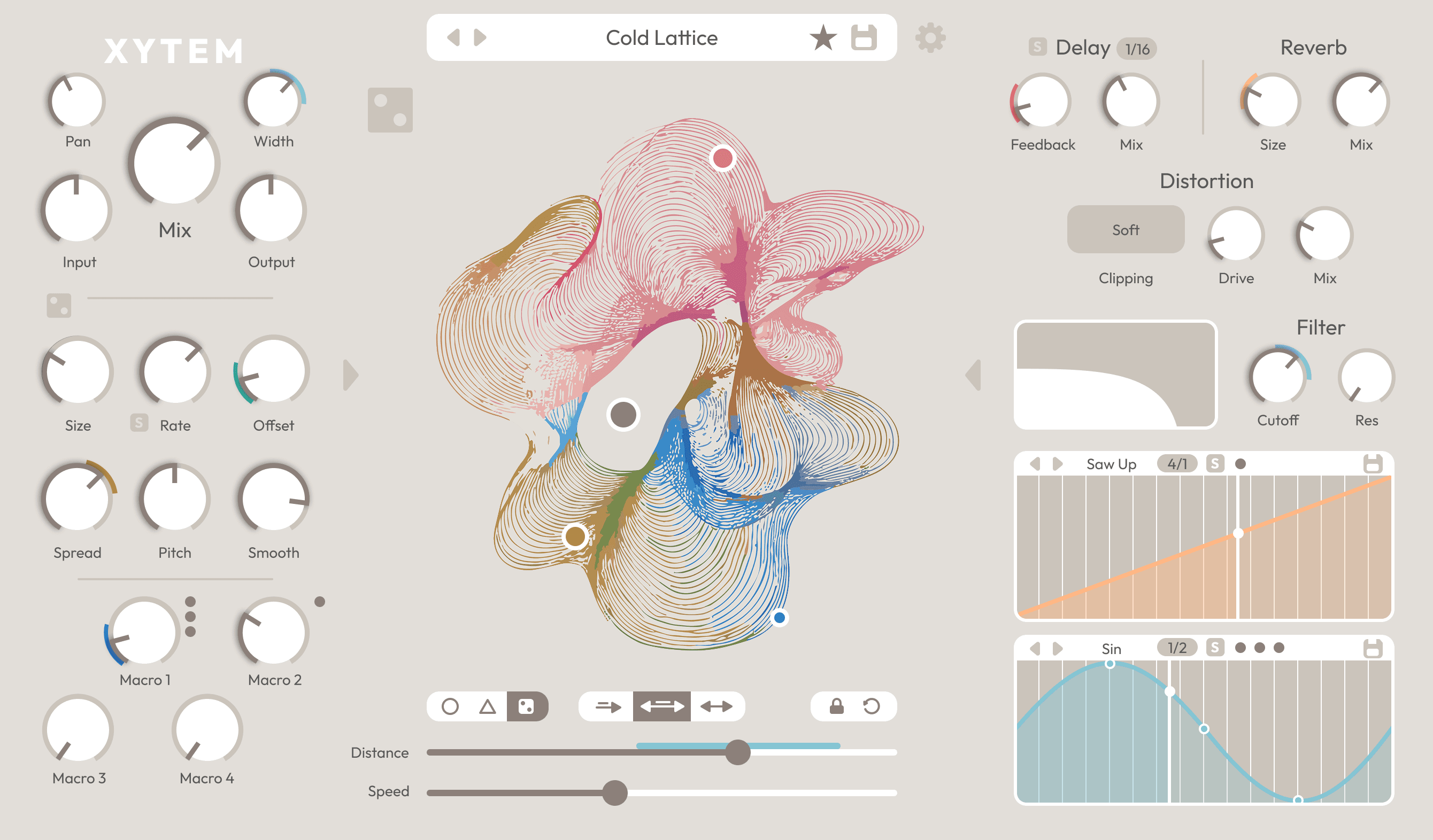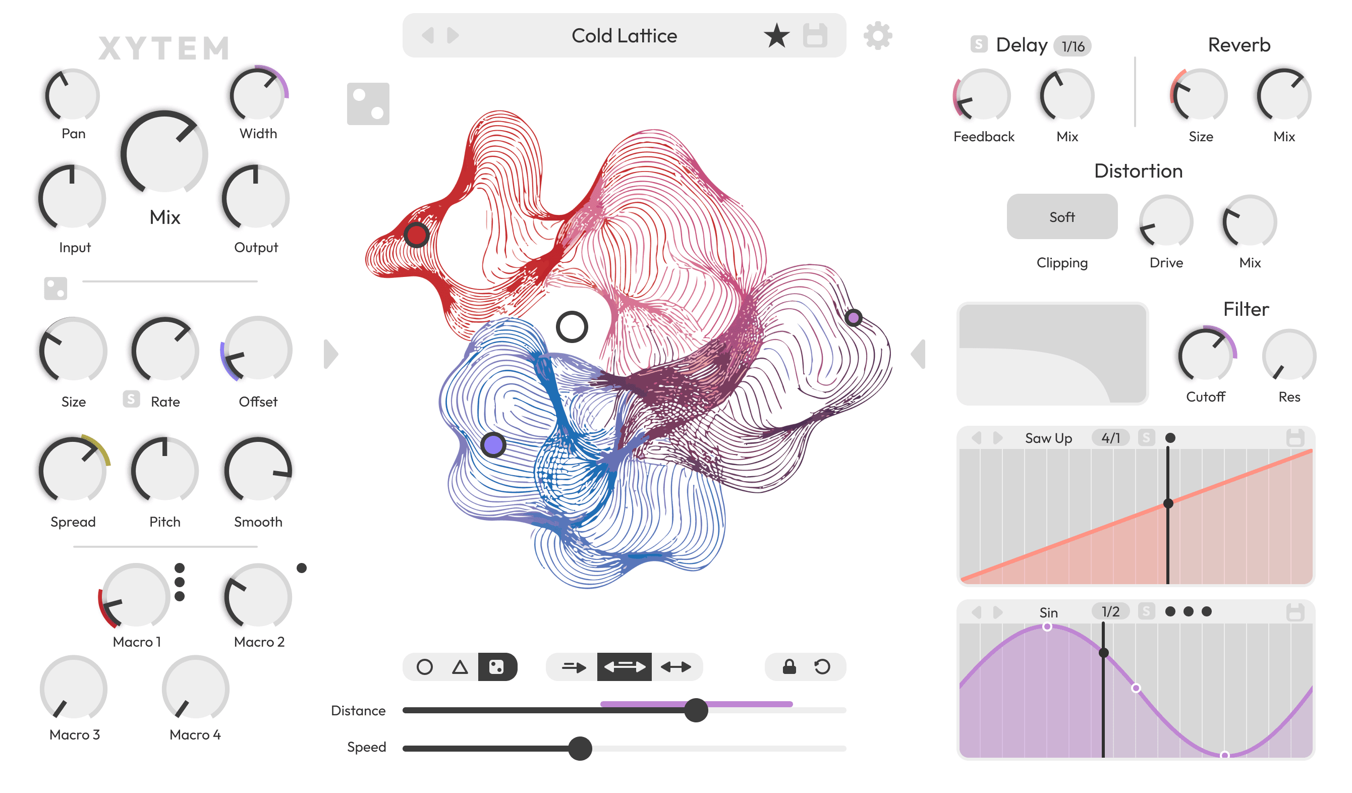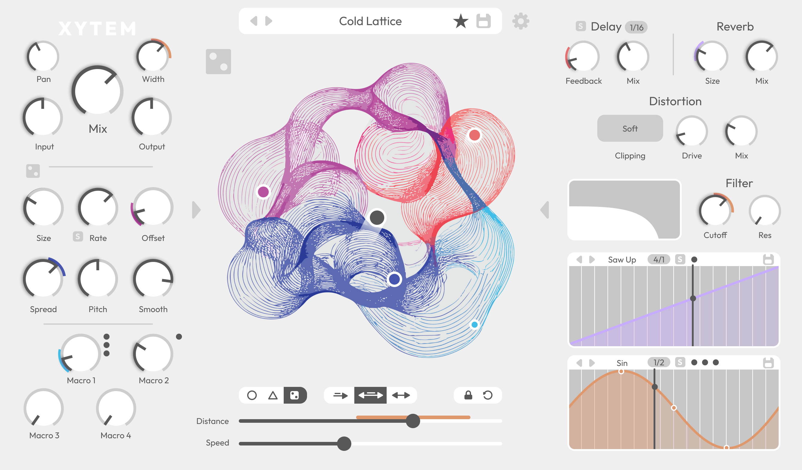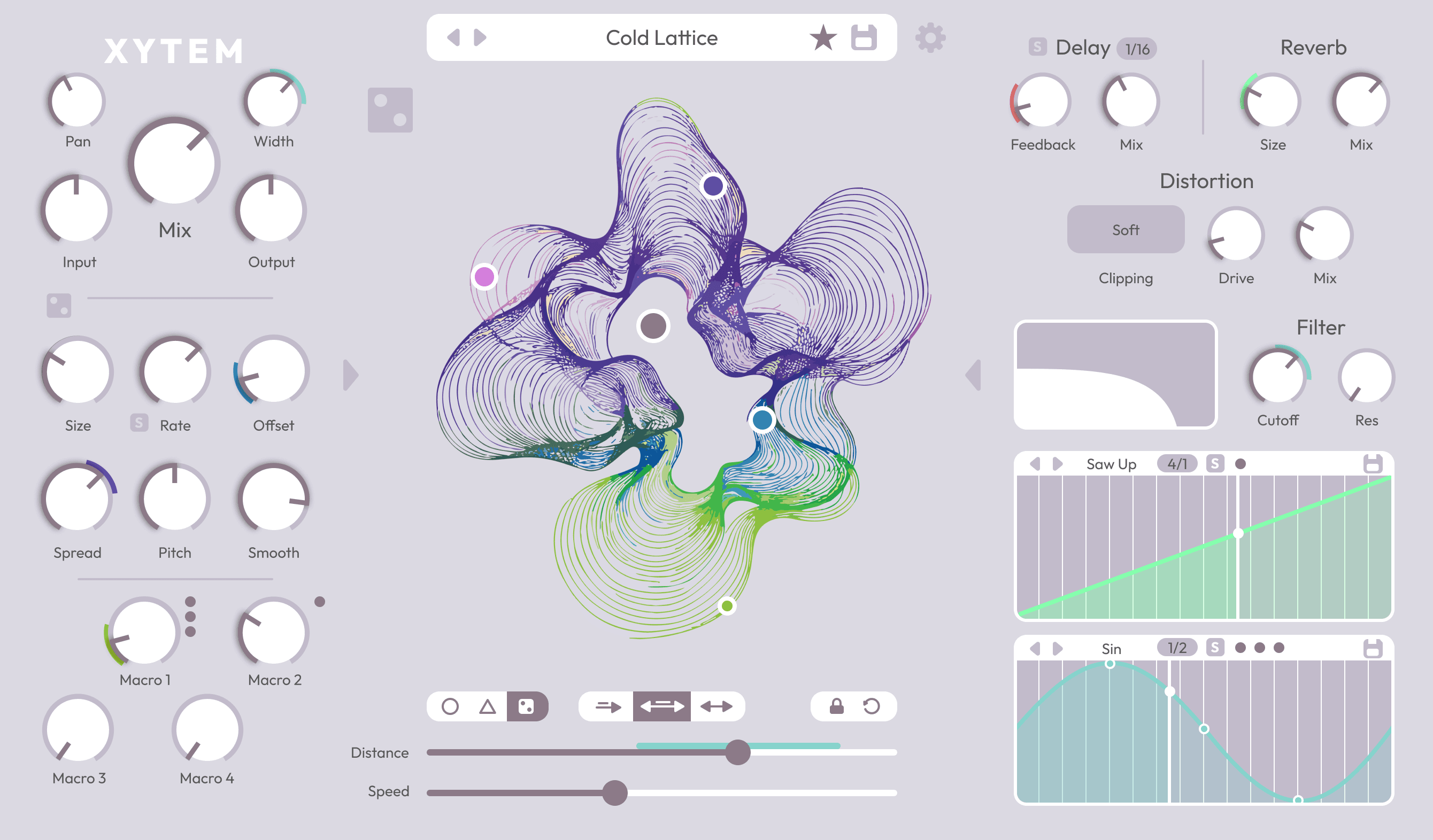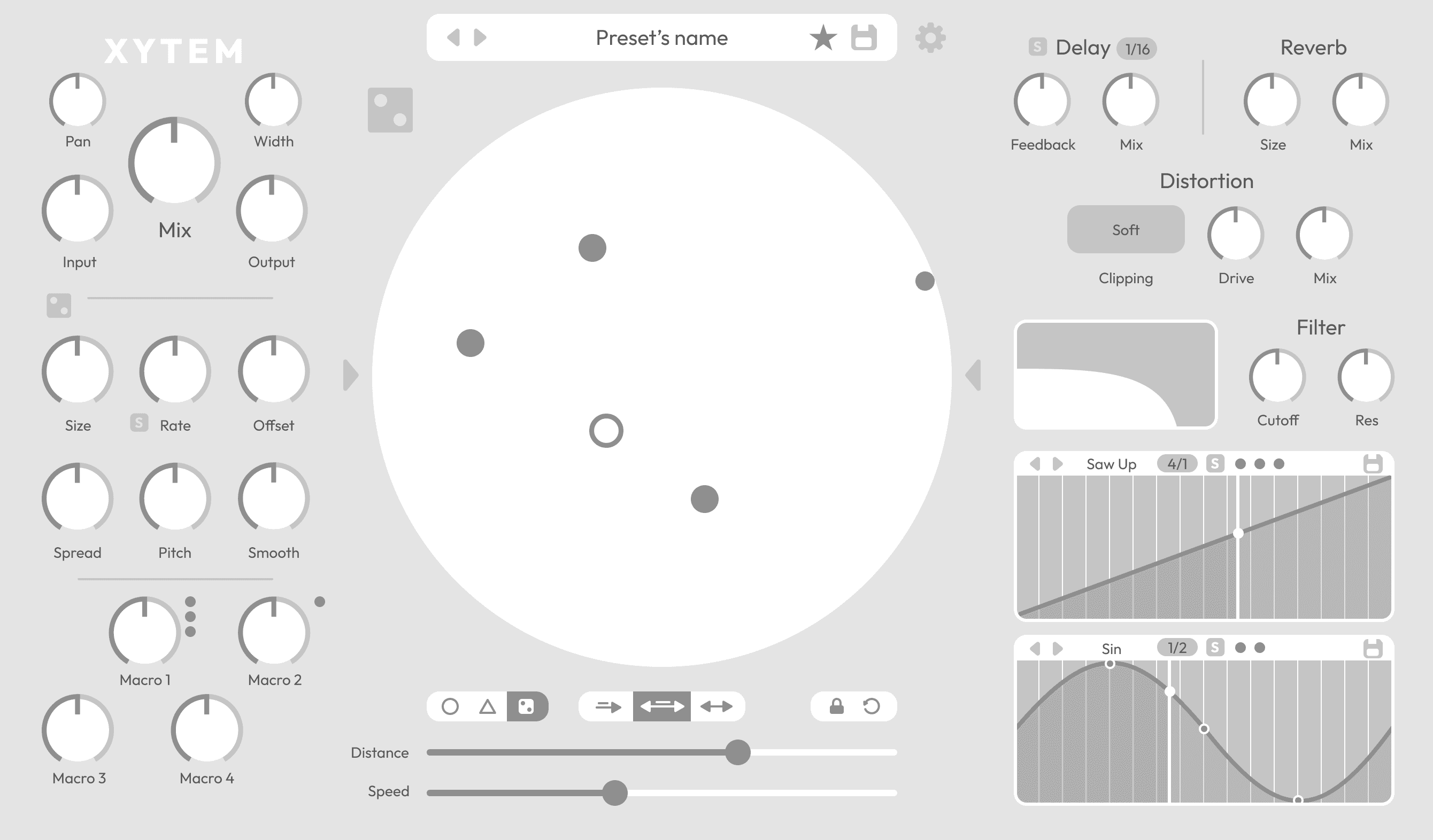 The interface is centered around a single motion field where parameters, automation, and movement meet. By keeping the system small but flexible — assignable nodes, two LFOs, and controlled randomisation — the design encourages trying ideas quickly and discovering unexpected results.