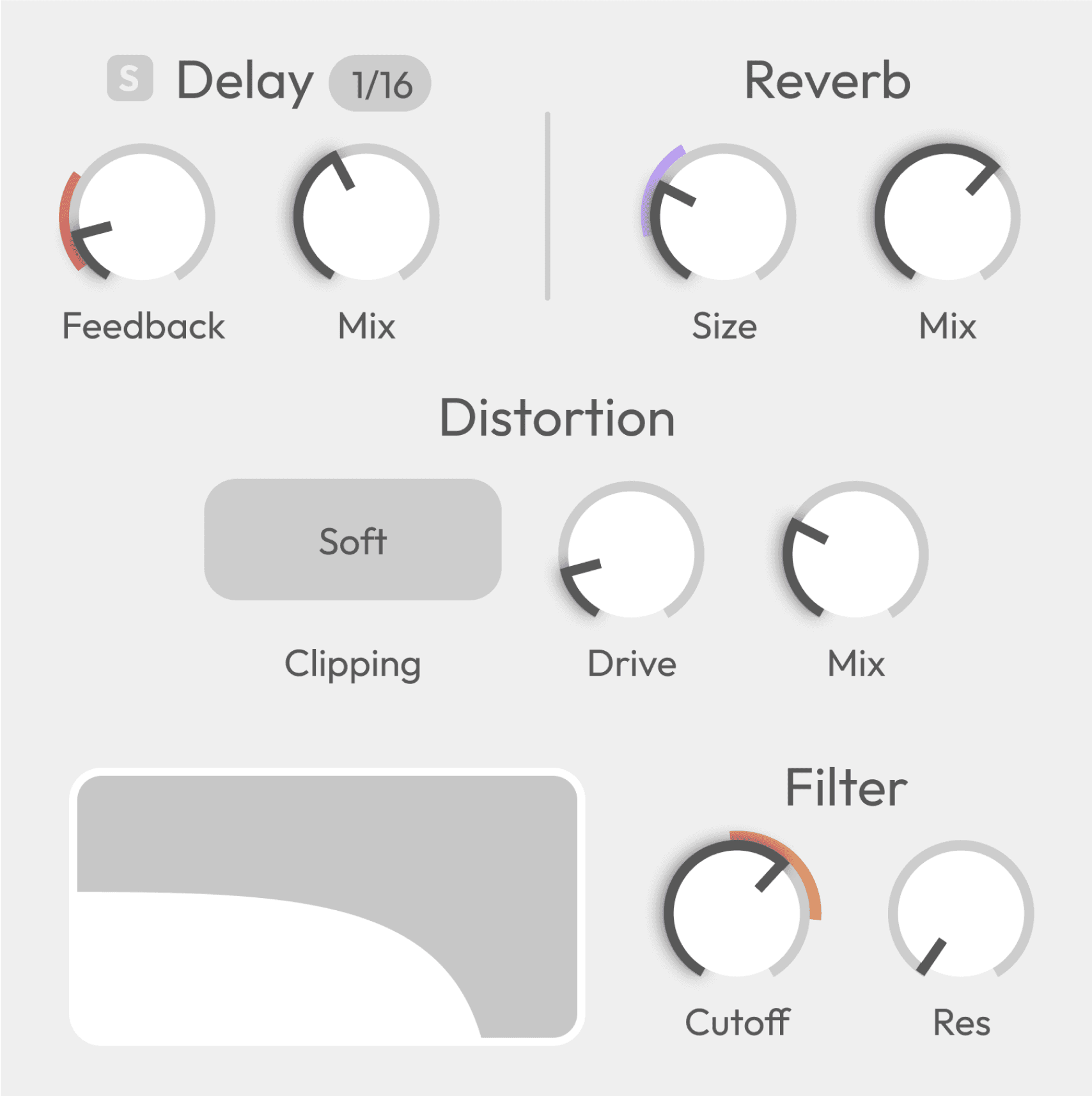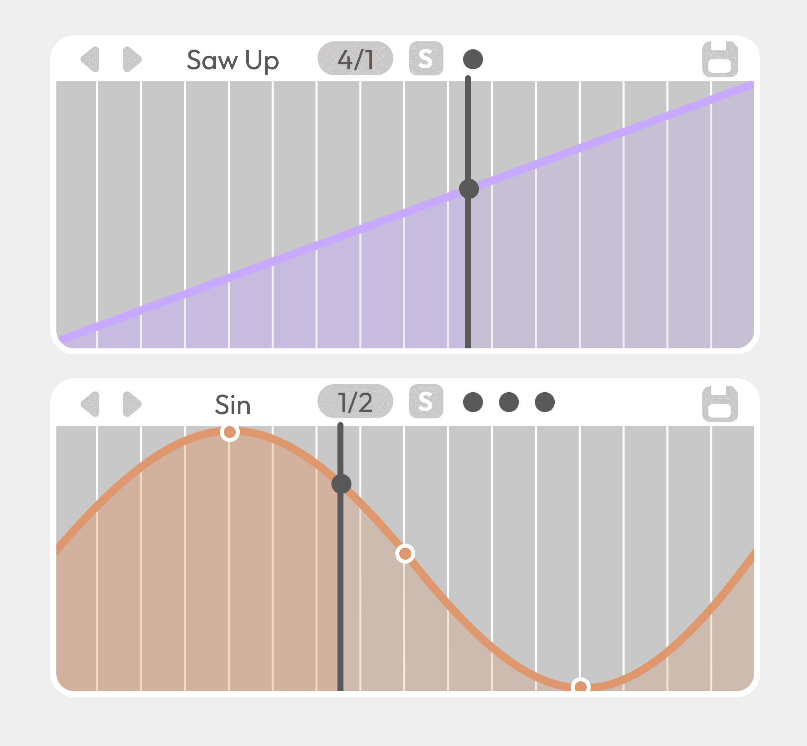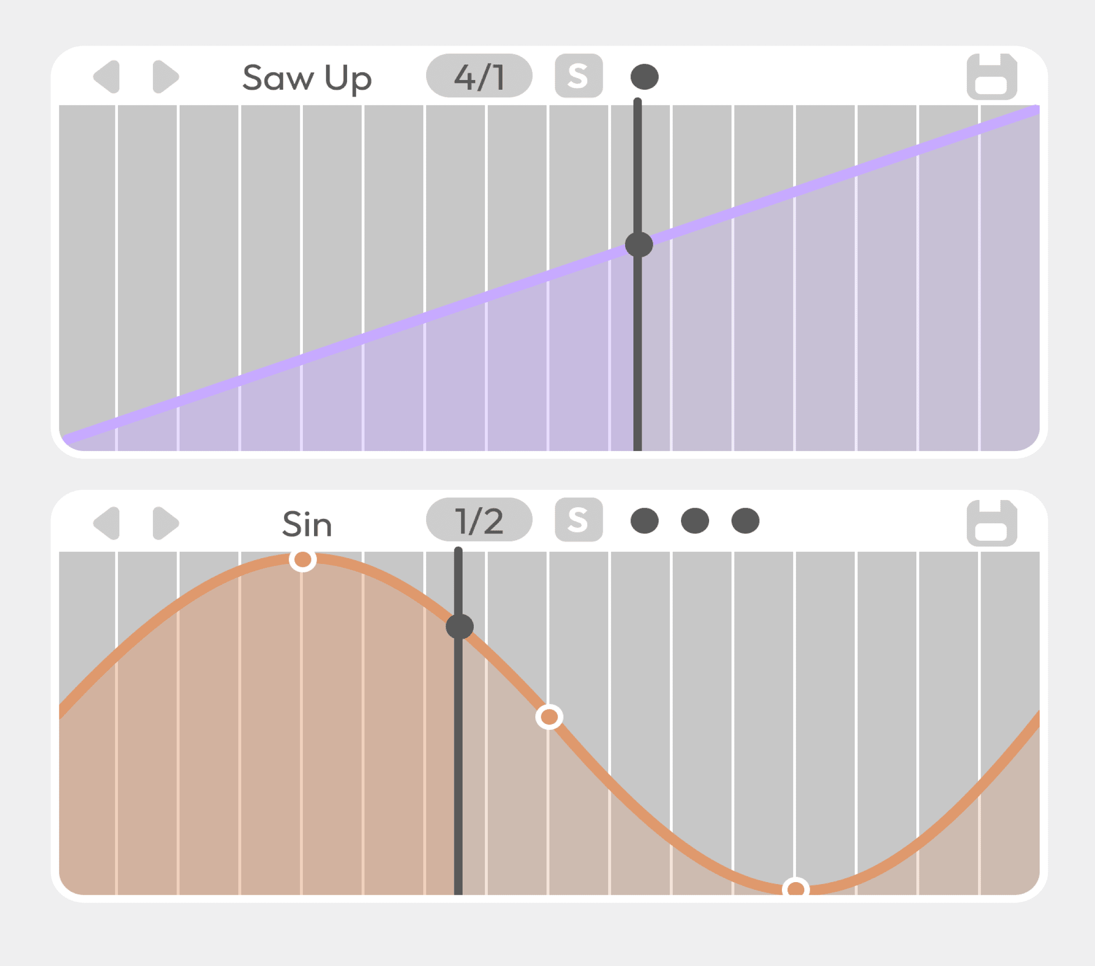 Sync buttons are used sparingly and only where they meaningfully relate to musical time. Their presence is meant to clarify when a parameter is tempo-aware, without turning timing into a dominant concern of the interface.