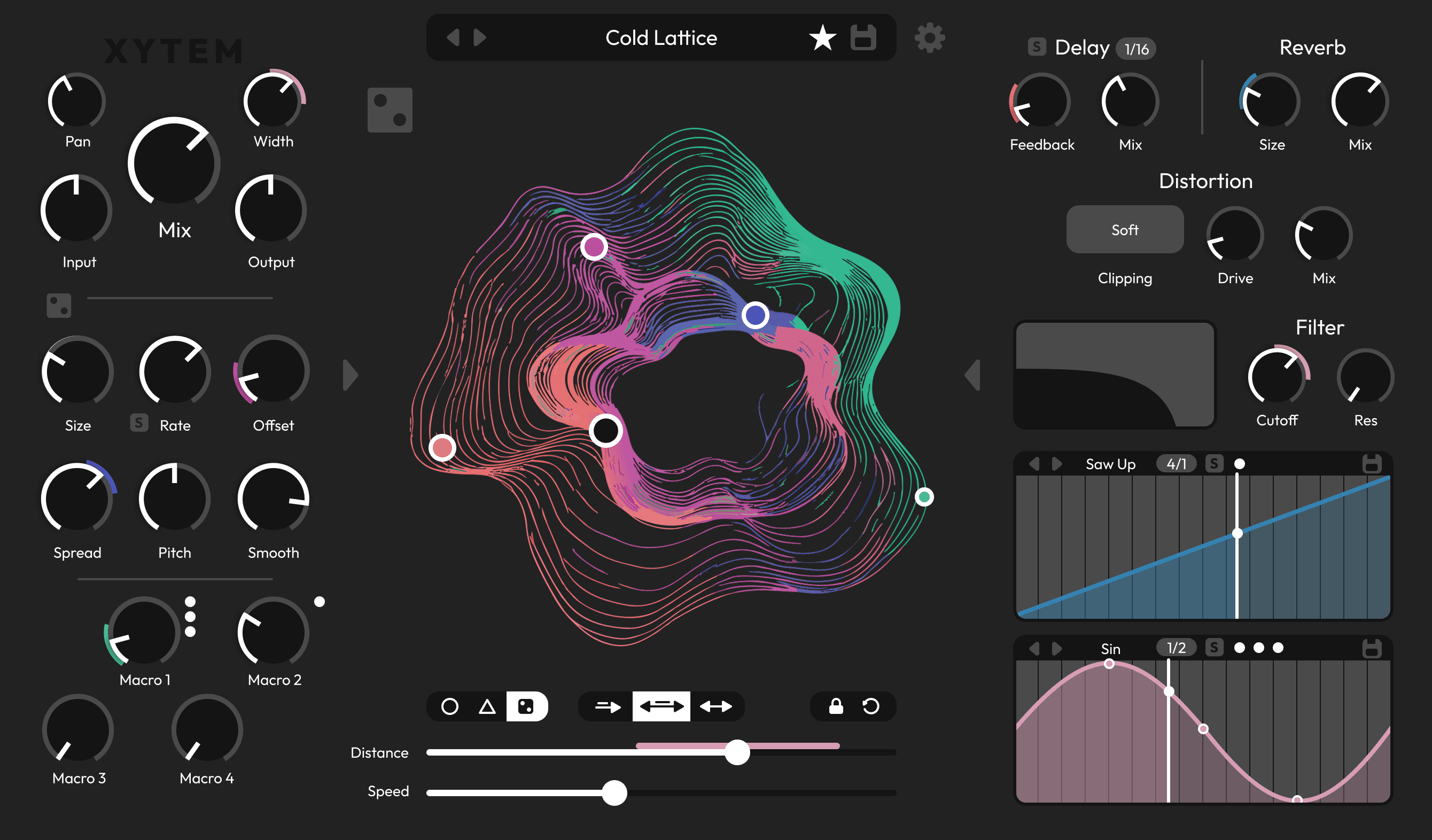 Drag and drop up to four parameters or macros into the motion field and shape them together using one main control point. Influence is defined by distance, turning motion into expressive, continuous change.
